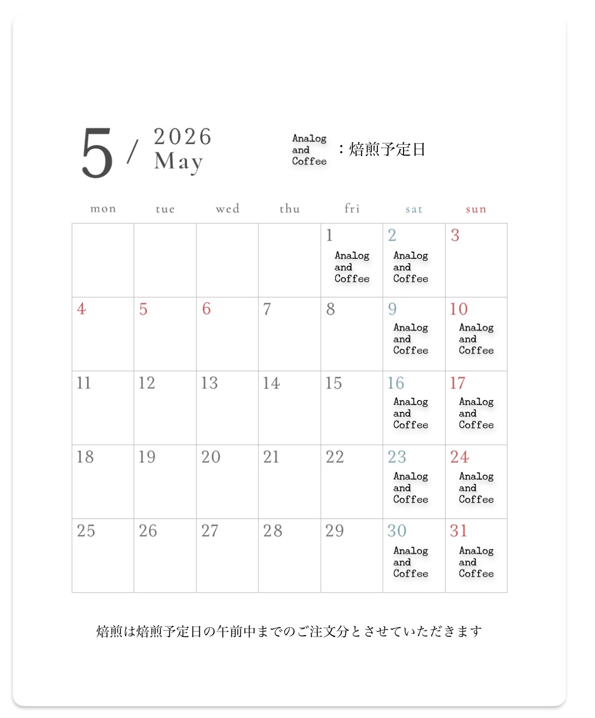 Analog and Coffee 2024.11.022026.04.03 NewsColumnAboutContactPrivacy-PolicynoteOnline Store ↑↑Online Storeはこちらから ↑↑ 今月の焙煎予定日はこちら News 【新商品のお知らせ】グアテマラ フライハーネス ウォッシュト 2026.04.152026.04.17 【新商品のお知らせ】オリジナルブレンド「Blue」 2026.03.15 【価格改定のお知らせ】オリジナルブレンド「Nightfly」 2026.03.09 【新商品のお知らせ】インドネシア マンデリン バタックブルー 2026.02.04 【新商品のお知らせ】エチオピア モカ ゲイシャ G-3 ナチュラル 2026.01.212026.02.04 News一覧はこちら Column コーヒーは果たして秘薬なのか? コーヒーの成分が大腸がん細胞増殖を抑制 2026.03.252026.03.27 独特なフレーバーを生むアナエロビック発酵とは 2026.03.232026.03.25 【レコード初心者おすすめvol.4】Donald Fagen – The Nightfly 2026.03.202026.03.25 Hario V60 ドリッパー NEO について 2026.02.262026.02.27 スペシャリティコーヒー”ゲイシャ”について 2026.01.27 Column一覧はこちら Category ↓↓Instagramで珈琲の最新情報をお届けしています!↓↓