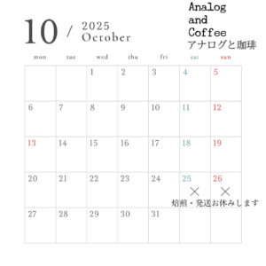 News 2025.01.222025.01.28 10/25,26は焙煎・発送をお休みいたします 2025年10月13日 【新商品のお知らせ】インドネシア アチェ ガジャ農園 2025年09月03日 【1周年記念】感謝の気持ちを込めて特別クーポンプレゼント! 2025年09月01日 【新商品のお知らせ】ブラジル グアリロバ ピンクブルボン 2025年08月12日 発送についてのお知らせ 2025年07月22日 【新商品のお知らせ】雲南プーアルハイランドナチュラル 2025年07月16日 【販売再開】オリジナルブレンド”Nightfly” 2025年05月29日 【再入荷のお知らせ】エチオピア イルガチェフェ アリーチャ 2025年05月29日 【新商品のお知らせ】DripBag Set 2025年05月26日 初めてマルシェに出店 2025年05月22日